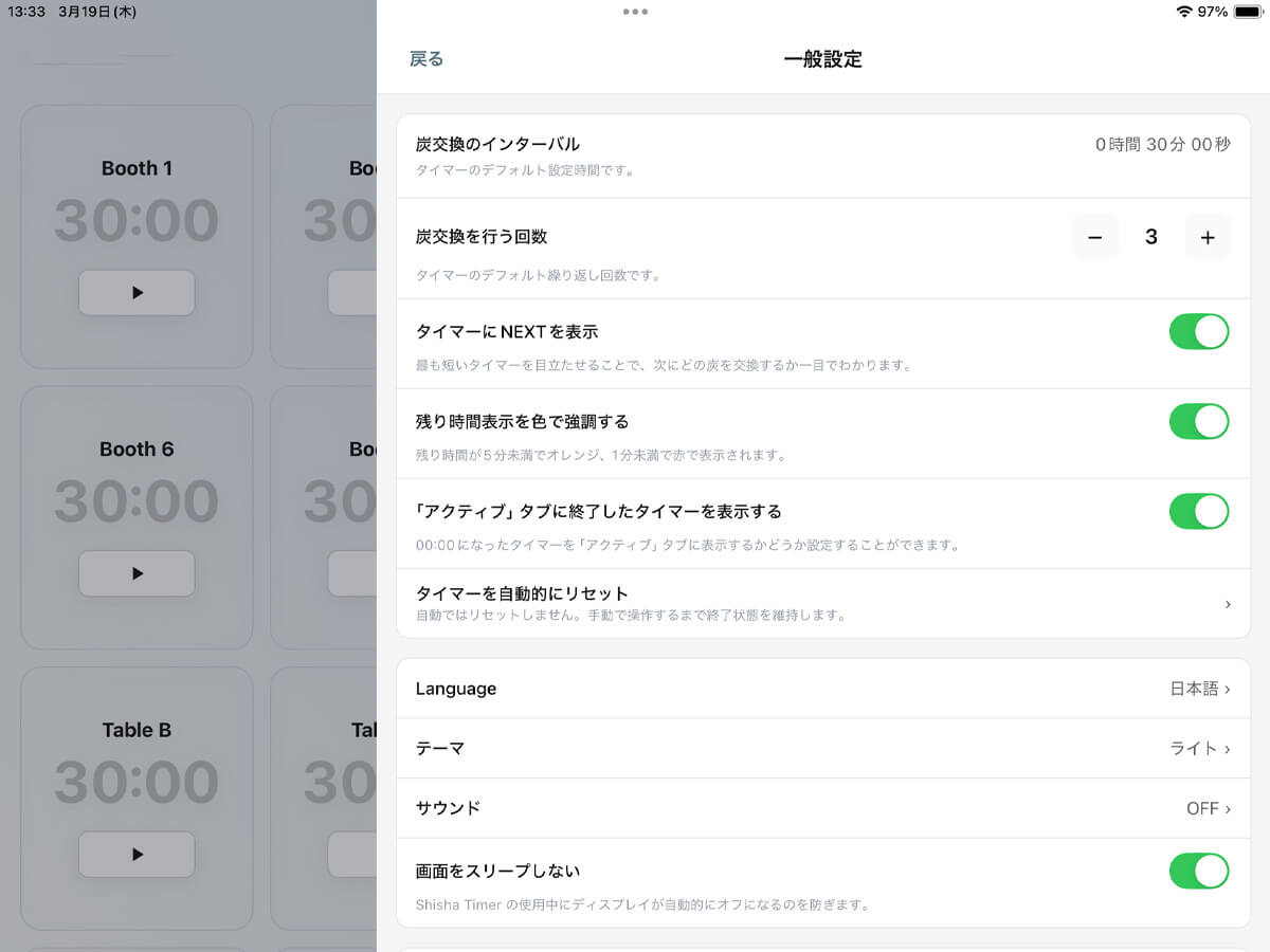 定期的な作業の間隔(時間)や回数、アラーム音のON/OFF、タイマーの数(席数)や各タイマーの名称(席名)などを設定します。