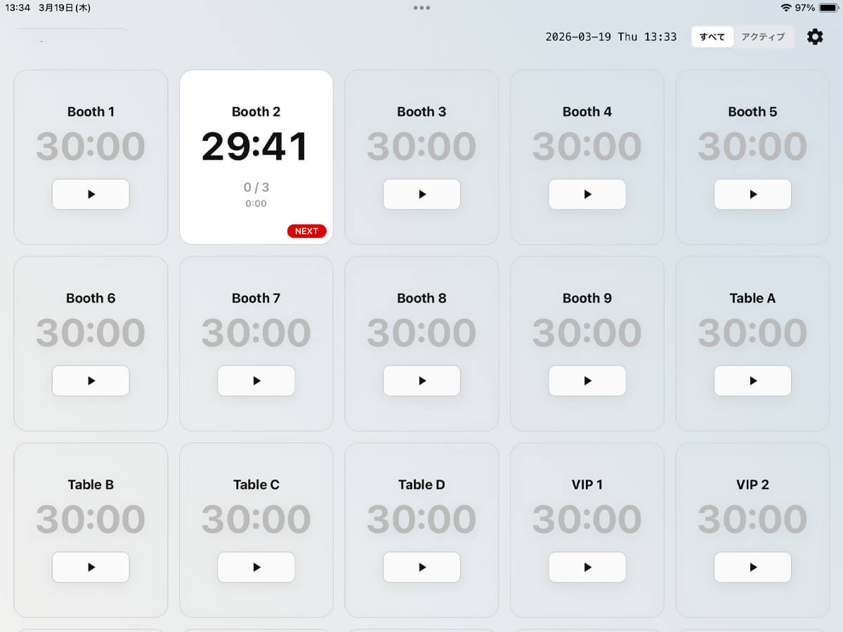 複数テーブルの時間を同時に管理。ピーク時でも各席の状況を把握できます。