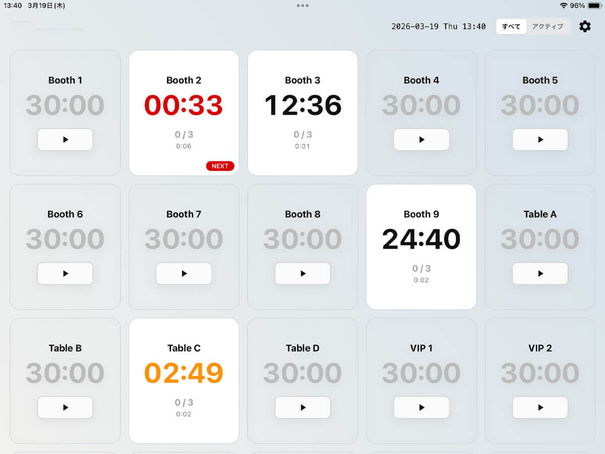 残り時間・繰り返し回数・総経過時間が表示されます。残り時間によって色を変えたり、次に対応する席にNEXTラベルも表示可能です。