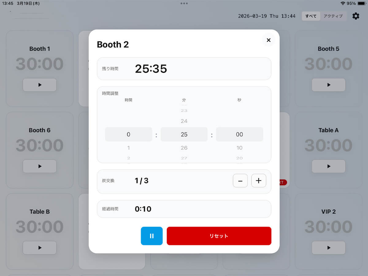 終了したタイマーはいつでも簡単にリセット。席回転のストレスを減らします。